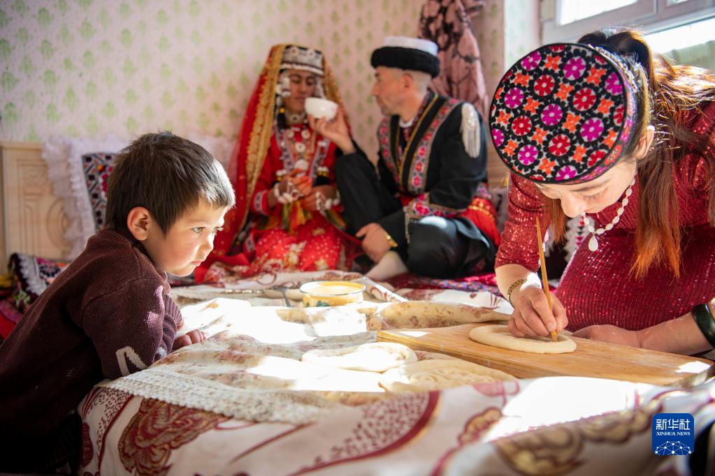 在位于縣城的新家中,新郎買熱買提汗·青鐵木爾的姐姐為一對新人制作象征祝福的馕餅,新郎的小侄女在一旁好奇觀看(3月20日攝)。