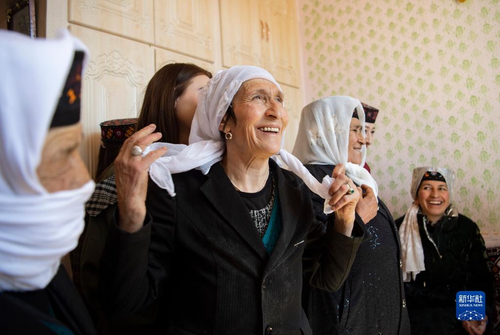 新郎買熱買提汗·青鐵木爾的母親和親友們在位于縣城的新家中有說有笑(3月20日攝)。