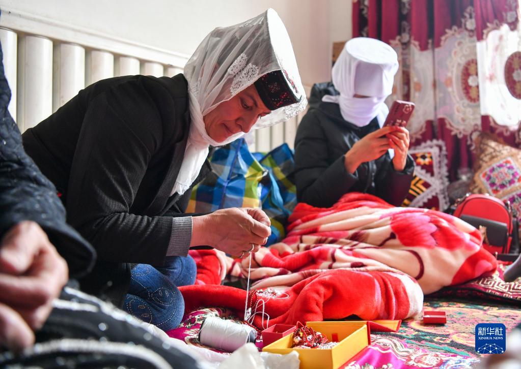新娘古麗汗·贊加比力的長輩在為她準備婚禮儀式上需要穿戴的飾品(3月18日攝)。