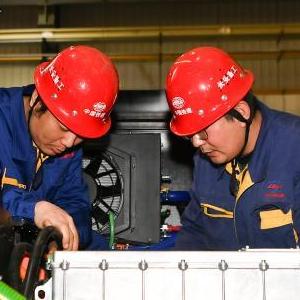 3月22日,中鐵長安重工有限公司的工人在生產線上調試即將下線的95噸純電動礦用自卸車。