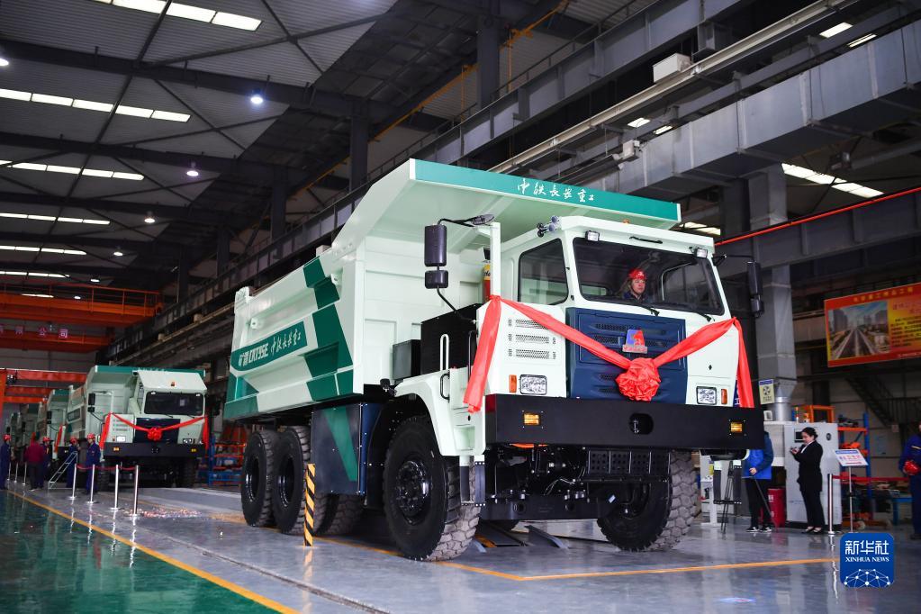 3月22日,中鐵長安重工有限公司的工人在生產線上試乘即將下線的95噸純電動礦用自卸車。