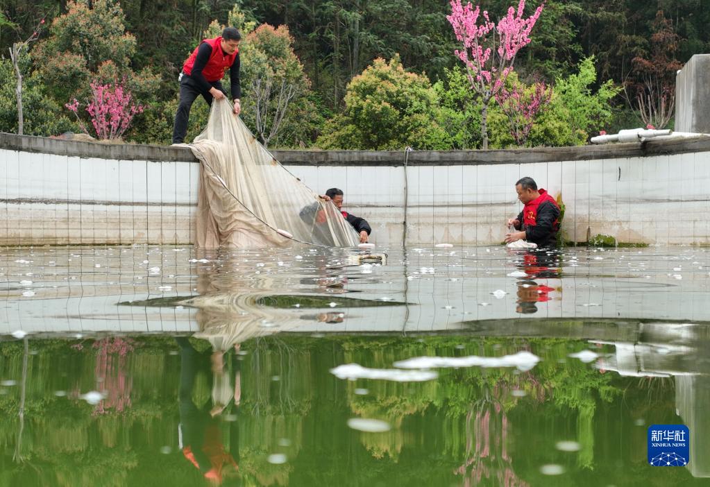 3月22日,衡山縣嶺坡鄉燈山村泉水魚養殖基地工作人員在捕魚。
