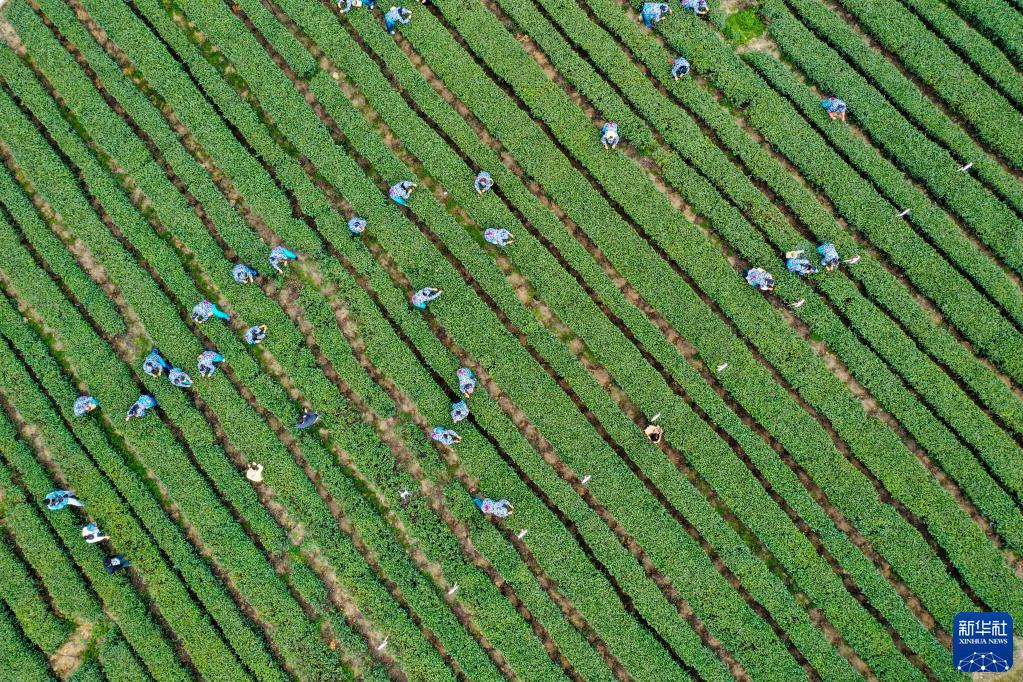 3月22日,在重慶市永川區永榮鎮鄉村振興就業園,采茶工在采摘茶葉(無人機照片)。