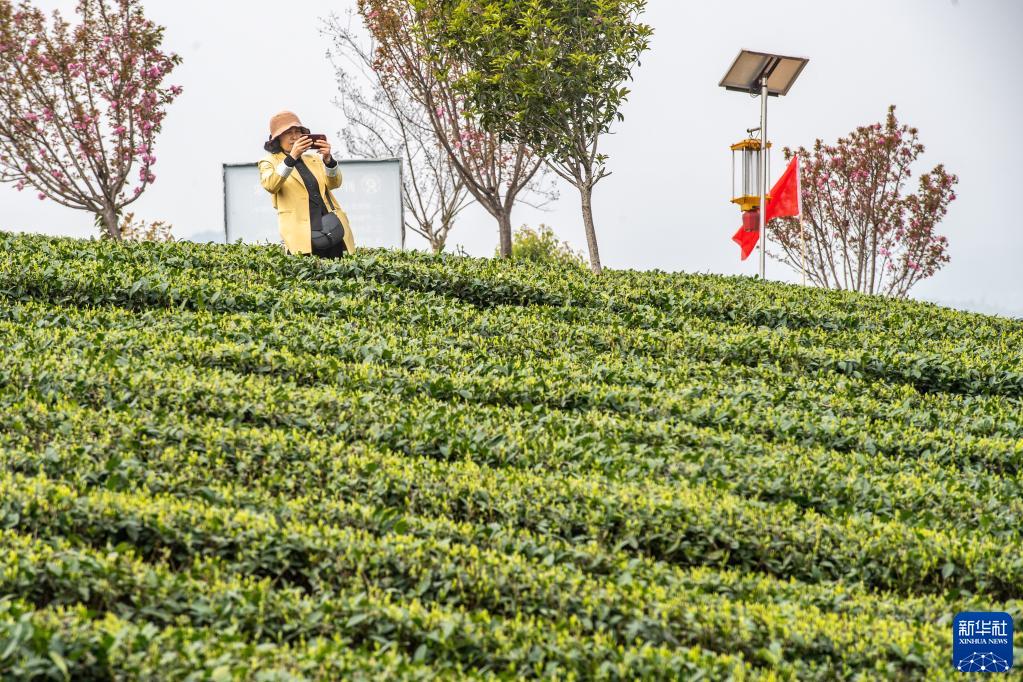 3月22日,在重慶市永川區永榮鎮鄉村振興就業園,游客在茶園內參觀游玩。