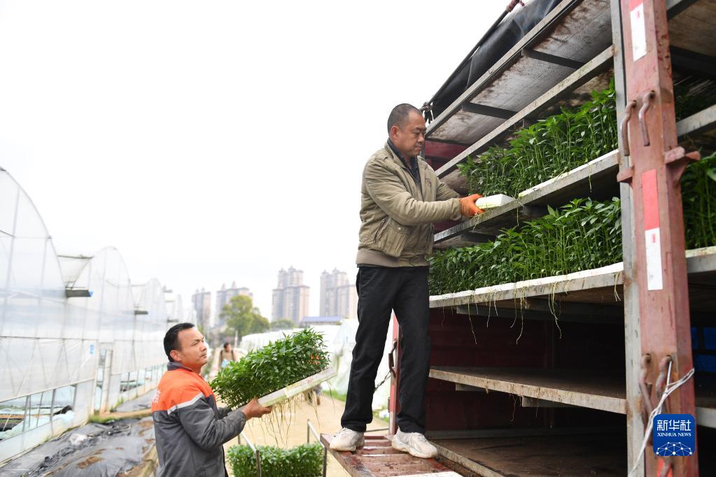 3月22日,農美種苗產業園工作人員將辣椒苗裝車。