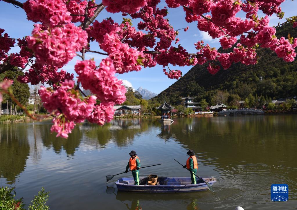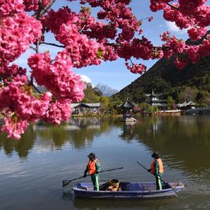 3月22日,在云南省麗江市古城區黑龍潭公園,環衛工人在打撈水面垃圾。