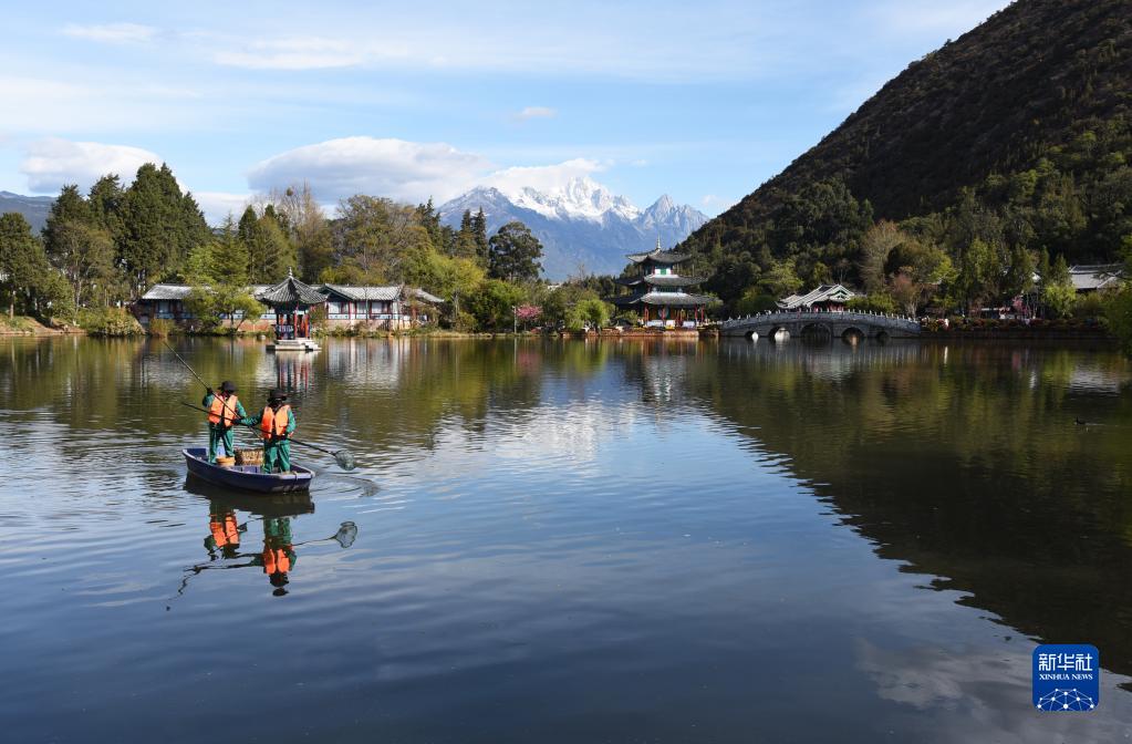 3月22日,在云南省麗江市古城區黑龍潭公園,環衛工人在打撈水面垃圾。