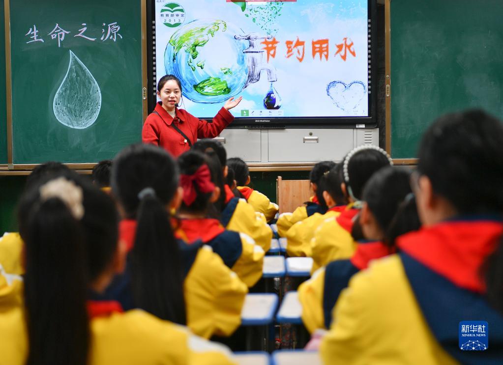 3月22日,在四川省廣安市前鋒區前鋒小學,老師在講解節水護水知識。