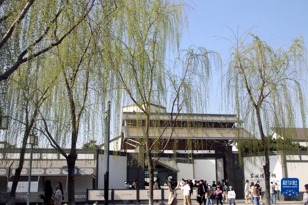 3月15日,游客從江蘇蘇州博物館旁的垂柳下經過。