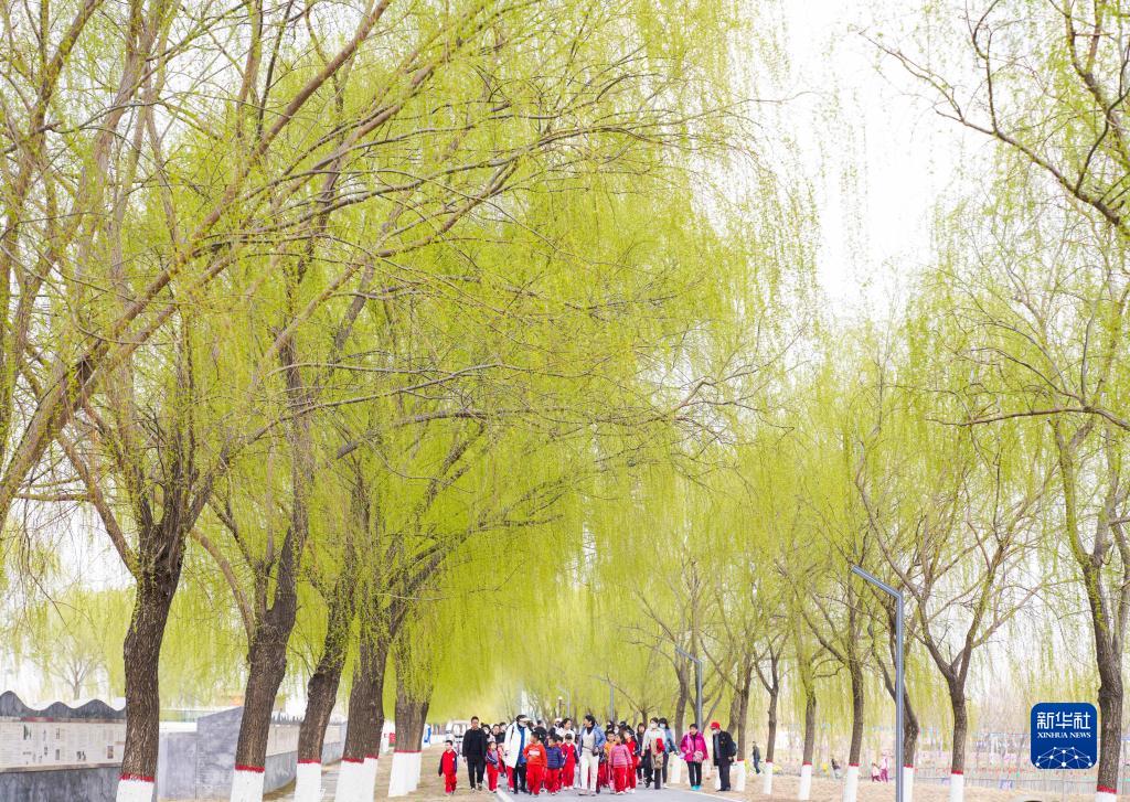 3月18日,山東省鄒平市第二實驗小學的學生在黃河臺子段大堤上賞柳游玩。