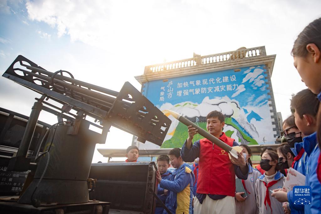 3月22日,在江西省廬山市,氣象局工作人員向小學生介紹人工增雨設備。