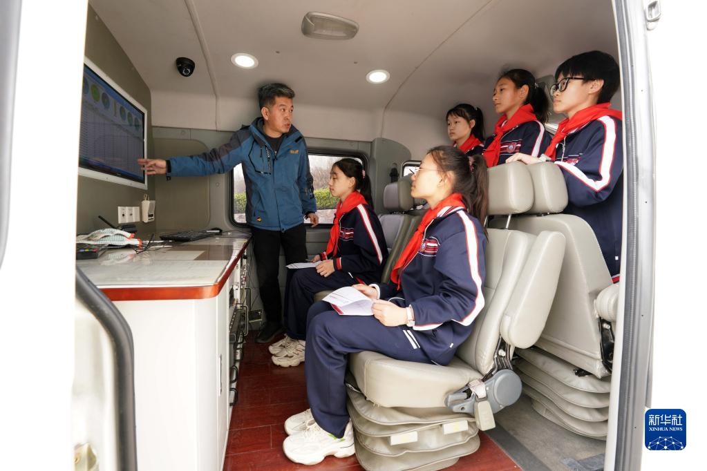 3月22日,河北省邢臺市第八中學學生在邢臺市氣象站參觀氣象應急車。