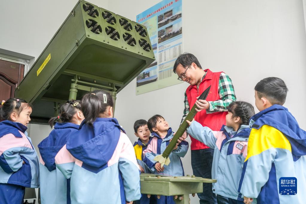 3月22日,在浙江省湖州市長興國家氣象觀測站,龍山街道中心幼兒園的孩子在了解人工增雨設備。
