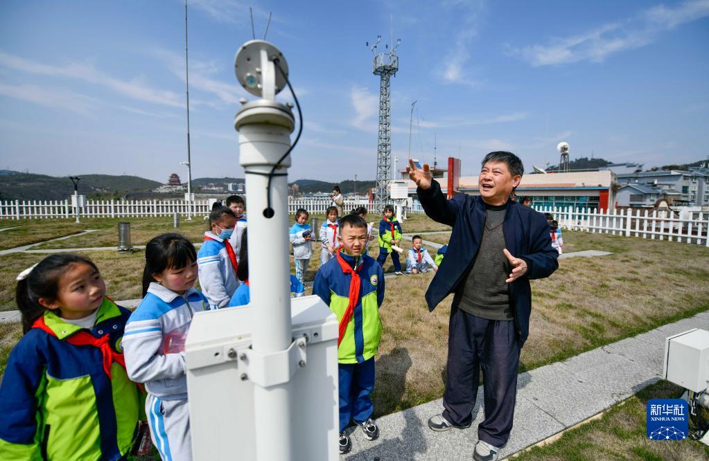 3月22日,工作人員在貴州福泉國家氣象觀測站向學生介紹氣象設備知識。