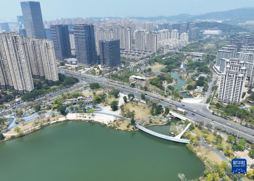 由水廊、綠廊貫穿的晉安湖公園、鶴林生態公園和牛崗山公園組成了晉安公園,是福州主城區首條生態廊道,也是福州防洪調蓄、打造韌性城市的樞紐(3月22日攝,無人機照片)。