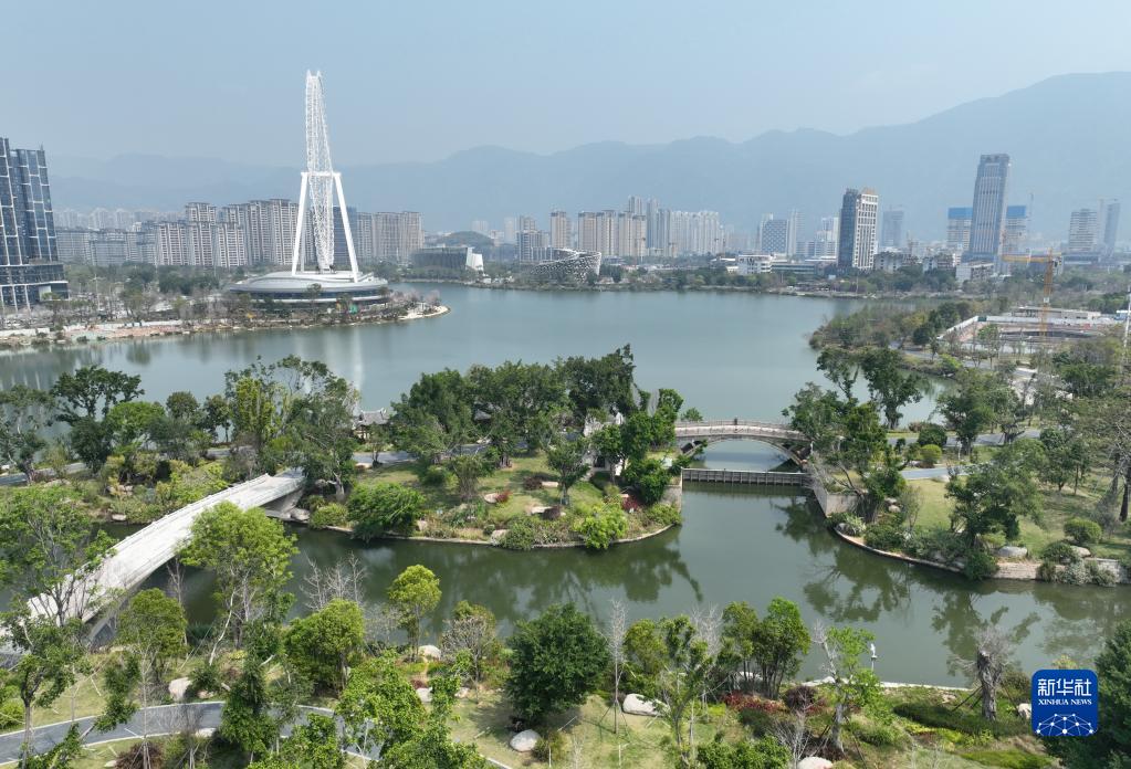人工開挖的福州晉安湖是城區調蓄庫容較大的生態湖,可實現防洪調蓄、生態補水、排水及湖內循環活水功能(3月22日攝,無人機照片)。