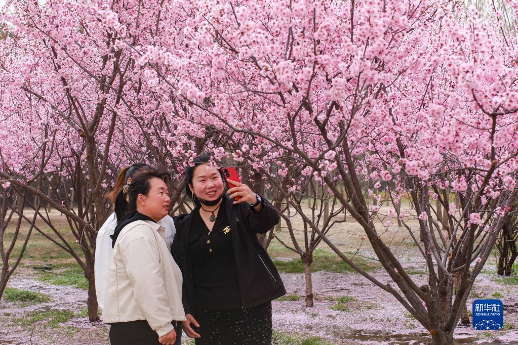 3月22日,游客在河南省安陽市殷都區的洹春園賞花留影。