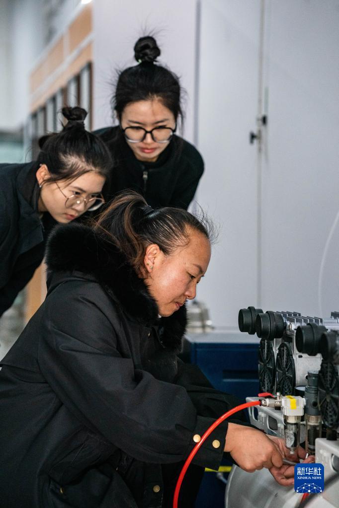 工作人員彭小清(前)和李曉莉(右)、殷鉞淼在香格里拉國家大氣本底站大氣成分業務用房對溫室氣體樣氣進行壓縮除水(3月9日攝)。