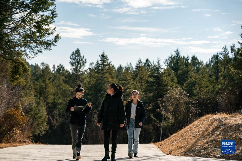 工作人員彭小清(中)和李曉莉(左)、殷鉞淼前往香格里拉國家大氣本底站大氣成分業務用房(3月9日攝)。