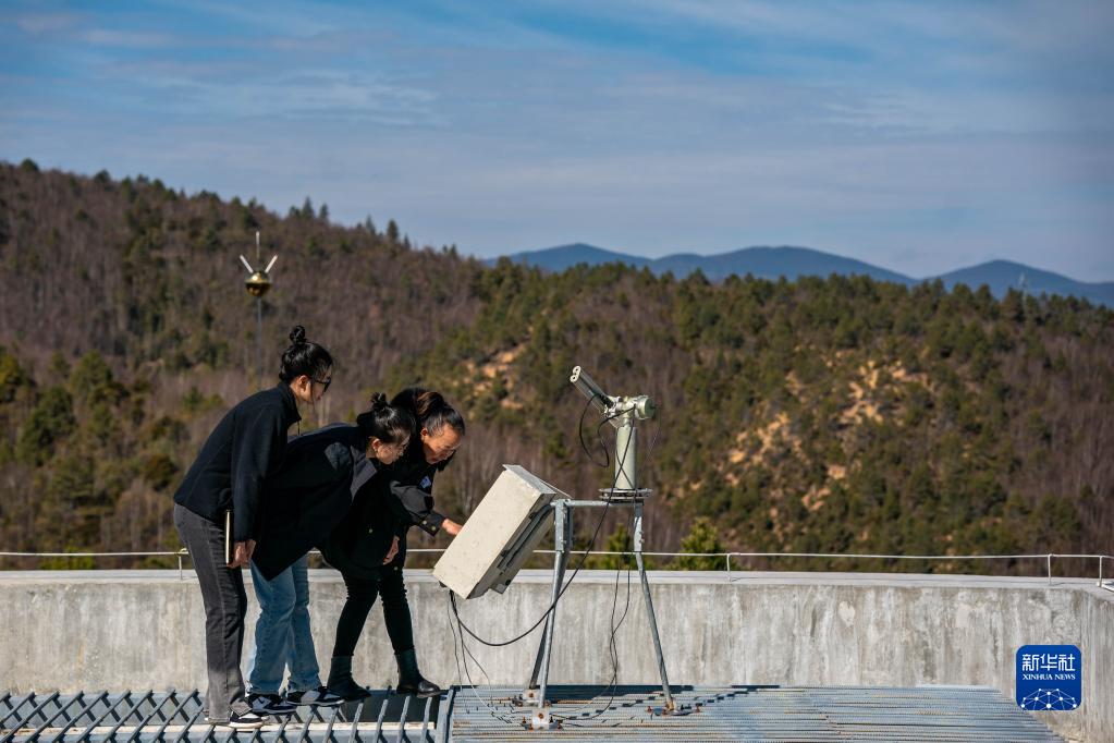 工作人員彭小清(右)和殷鉞淼(中)、李曉莉在香格里拉國家大氣本底站大氣成分業務用房進行全自動太陽光度計巡視(3月9日攝)。