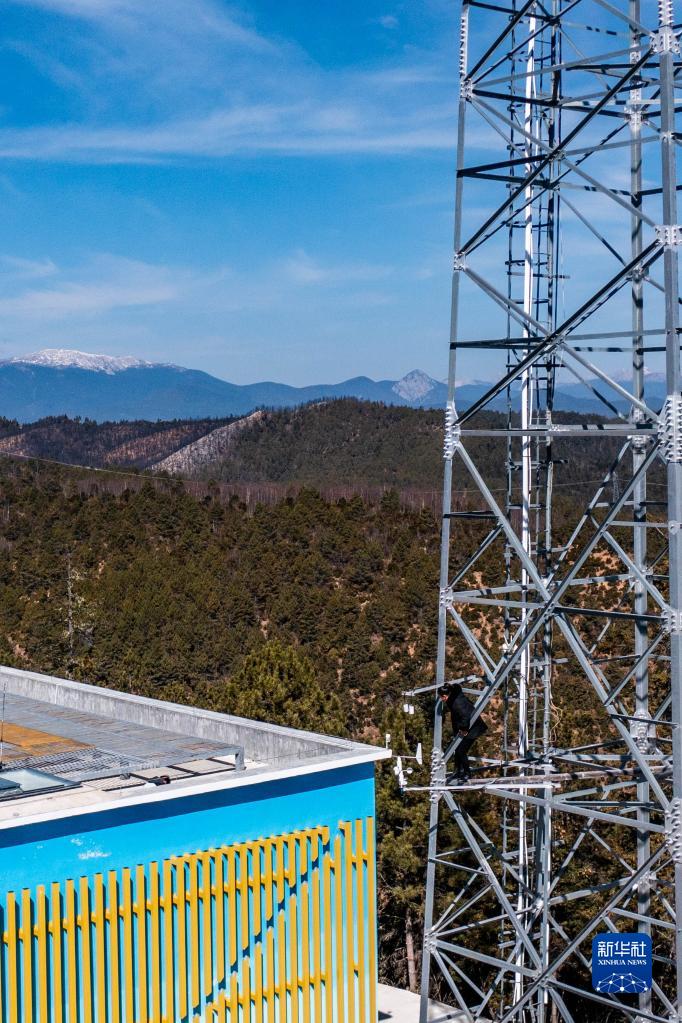 工作人員彭小清在香格里拉國家大氣本底站巡查鐵塔溫室氣體10米進氣口(3月9日攝,無人機照片)。