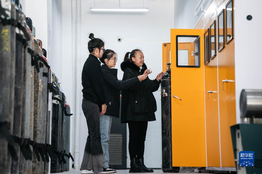 工作人員彭小清(右)和殷鉞淼(中)、李曉莉在香格里拉國家大氣本底站大氣成分業務用房更換溫室氣體氣相色譜儀氮氣瓶(3月9日攝)。