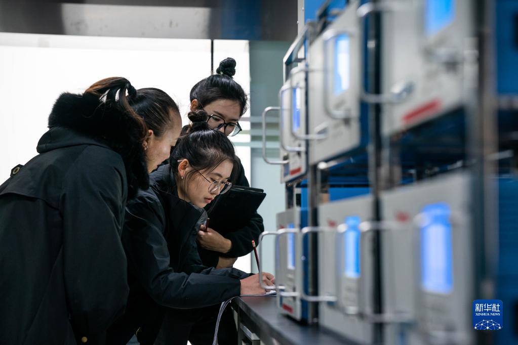 工作人員殷鉞淼(中)和彭小清(左)、李曉莉在香格里拉國家大氣本底站大氣成分業務用房對反應性氣體進行巡視(3月9日攝)。