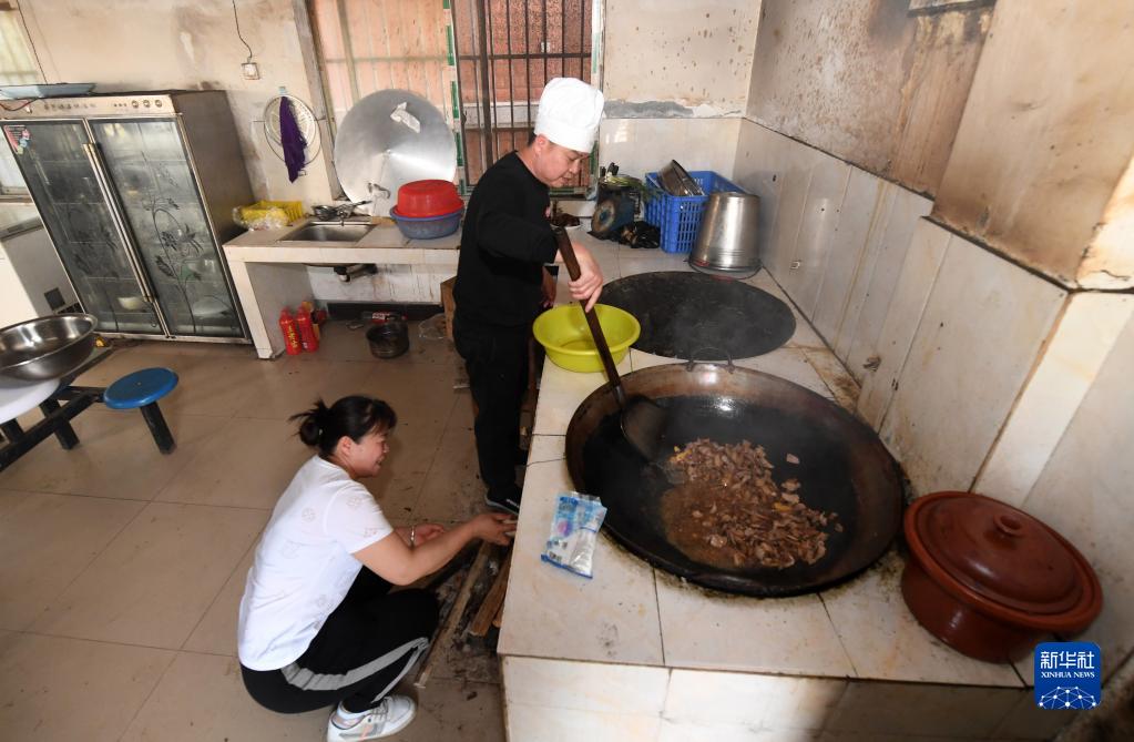 在廣西德??h東凌鎮那王小學,黃永勇(右)和黃秀碧在給學生做午餐(3月22日攝)。
