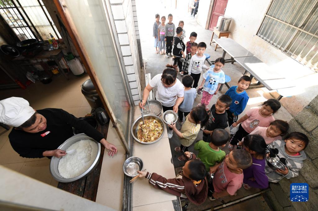 在廣西德??h東凌鎮那王小學,黃永勇(左一)和黃秀碧在給學生分午餐(3月22日攝)。
