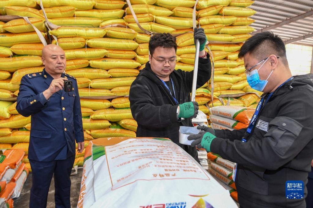 3月23日,在吉林省四平市梨樹縣一家農資生產企業,梨樹縣市場監督管理局工作人員(左一)聯合第三方檢驗機構對企業生產的產品進行抽樣檢驗。