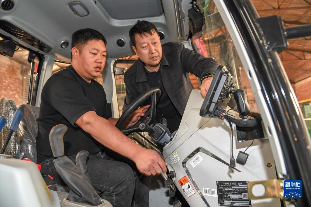 3月23日,在吉林省四平市梨樹縣白山鄉岫巖村,梨樹縣農機推廣總站站長張志剛(右)幫助農民調試農機。