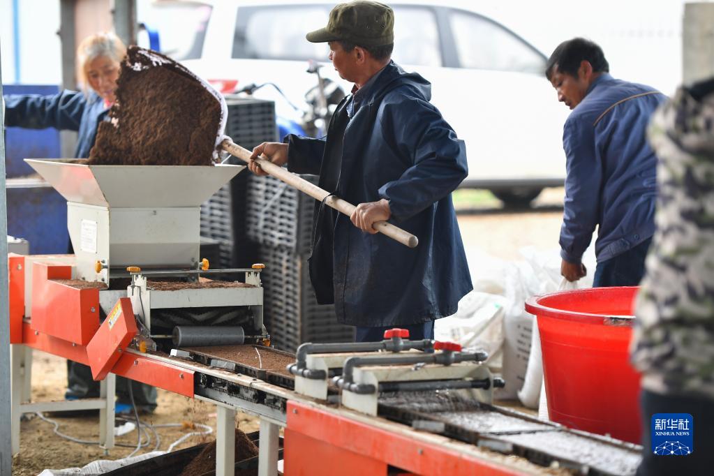 3月23日,在湘潭市雨湖區姜畬鎮青亭村,農民使用水稻秧盤育秧播種機制作秧盤。