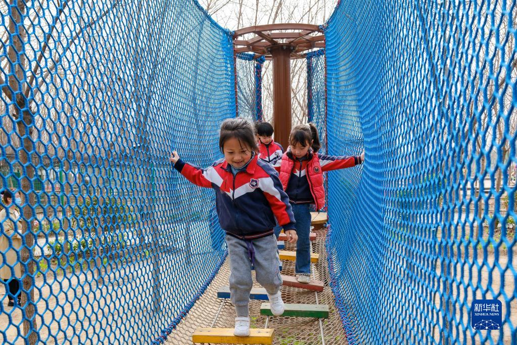 3月22日,呂村鎮星星幼兒園的小朋友在西裴村“豬豬樂園”兒童游樂場玩耍。