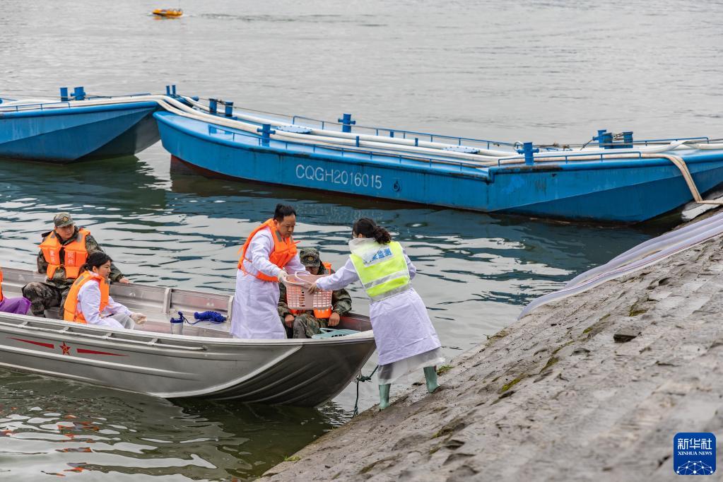 3月23日,在重慶市銅梁區高樓鎮涪江流域突發水污染事件應急聯合演練現場,環境監測人員將取到的江水樣品遞給岸邊工作人員。