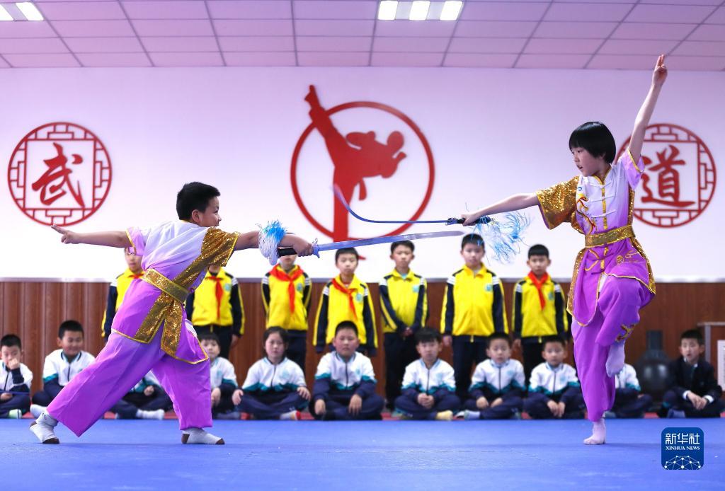 3月23日,青島市通濟實驗學校的學生在大課間進行武術劍對練。