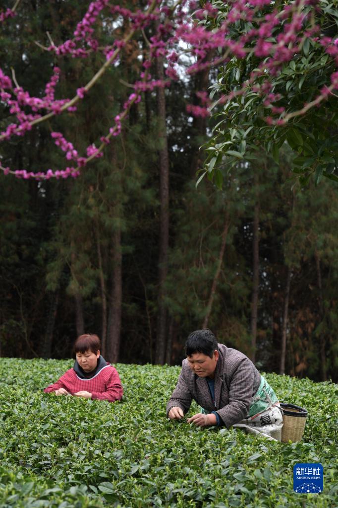 3月23日,村民在鳳岡縣永安鎮田壩社區生態茶園基地采摘春茶。