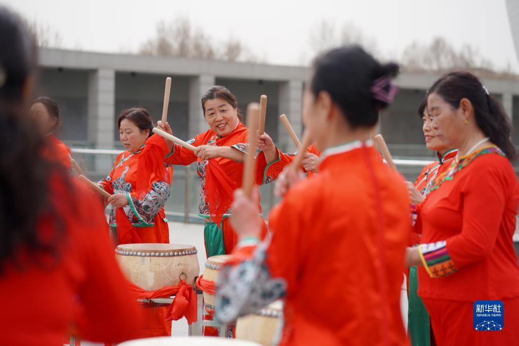 3月23日,群眾在內丘縣邢窯博物館廣場學習慶源排鼓。