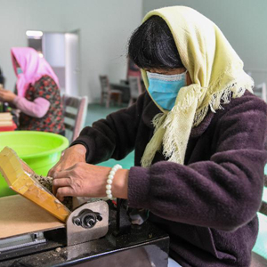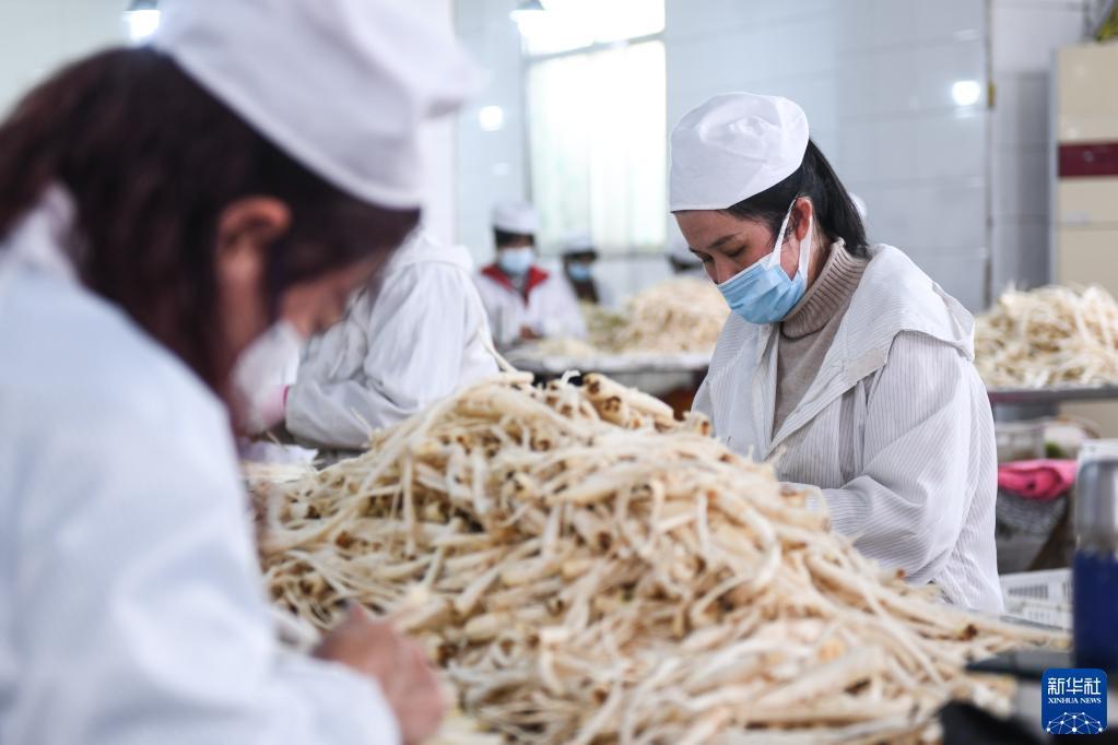 3月23日,村民們在南魯山鎮沂源華康食品有限公司共富車間內加工桔梗。