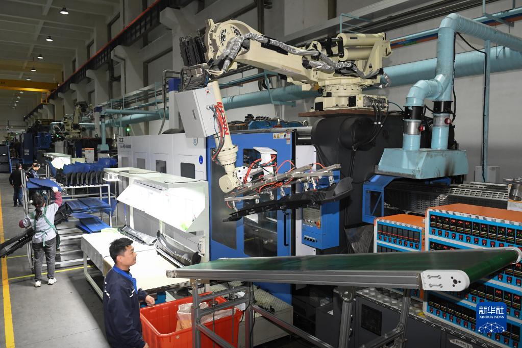 在位于臺州市的浙江博弈科技股份有限公司自動化生產線上,工業機器人和人工合作生產汽車部件(3月21日攝)。該公司是國內汽車輕量化塑料零部件行業龍頭企業,專注于高端汽車零部件生產。