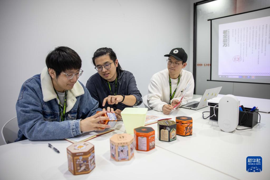 在位于杭州市的浙江仁之初健康產業有限公司內,員工在討論食品的外包裝設計(3月23日攝)。
