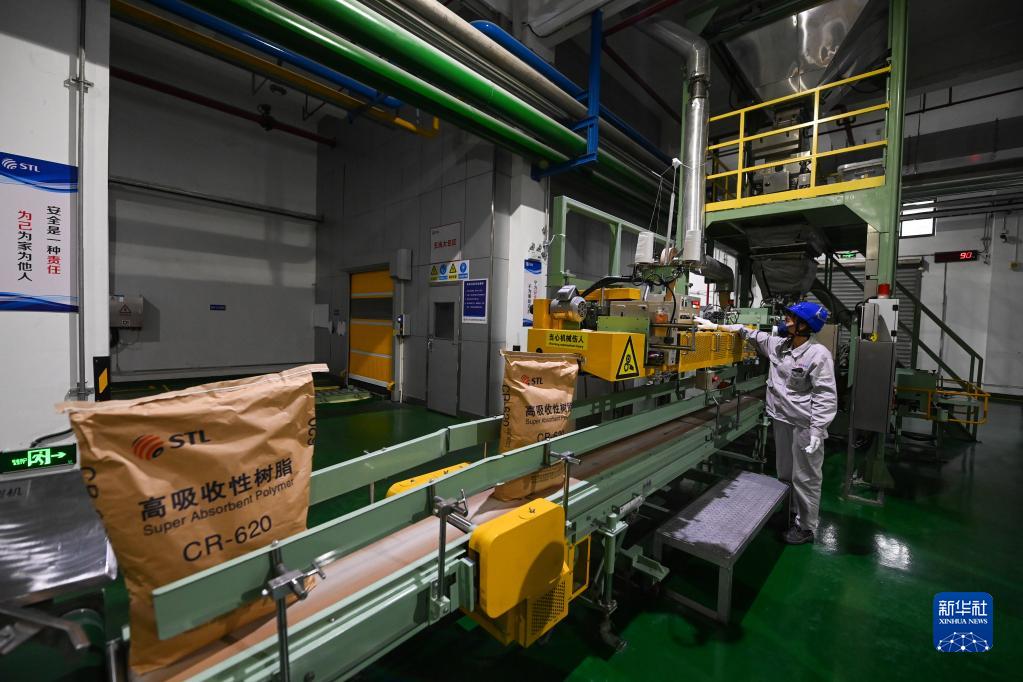 在衛星化學股份有限公司高新區嘉興基地內,包裝工通過自動包裝系統進行產品包裝(3月23日攝)。該公司先后榮獲中國500強、中國制造業500強、國家制造業單項冠軍示范企業等獎項,2022年獲評單項冠軍企業。