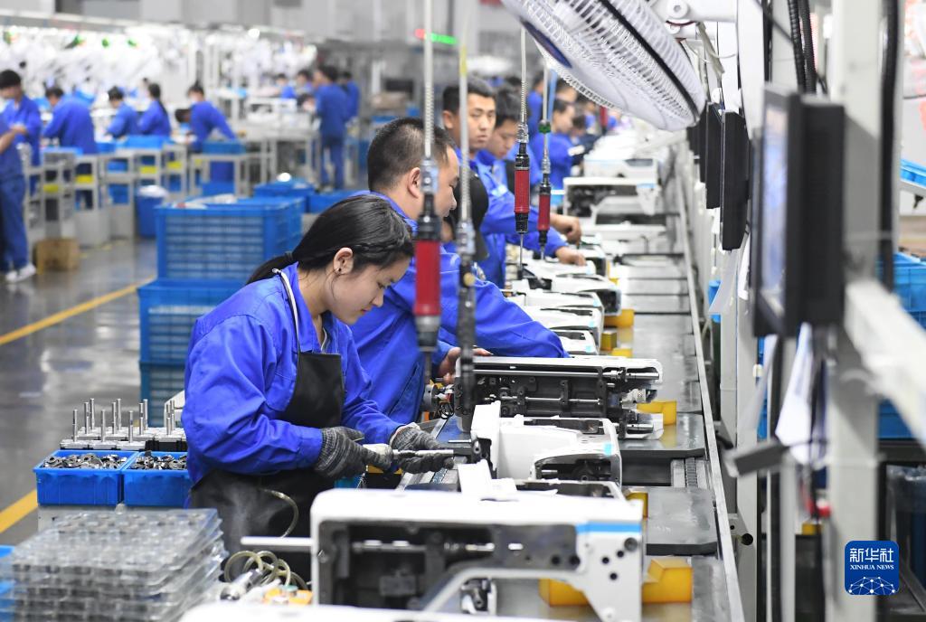 在位于臺州市的杰克科技股份有限公司,工作人員在裝配車間裝配縫紉機(3月23日攝)。該公司作為全球縫制設備行業產銷規模最大的企業之一,開年以來訂單保持增長勢頭。