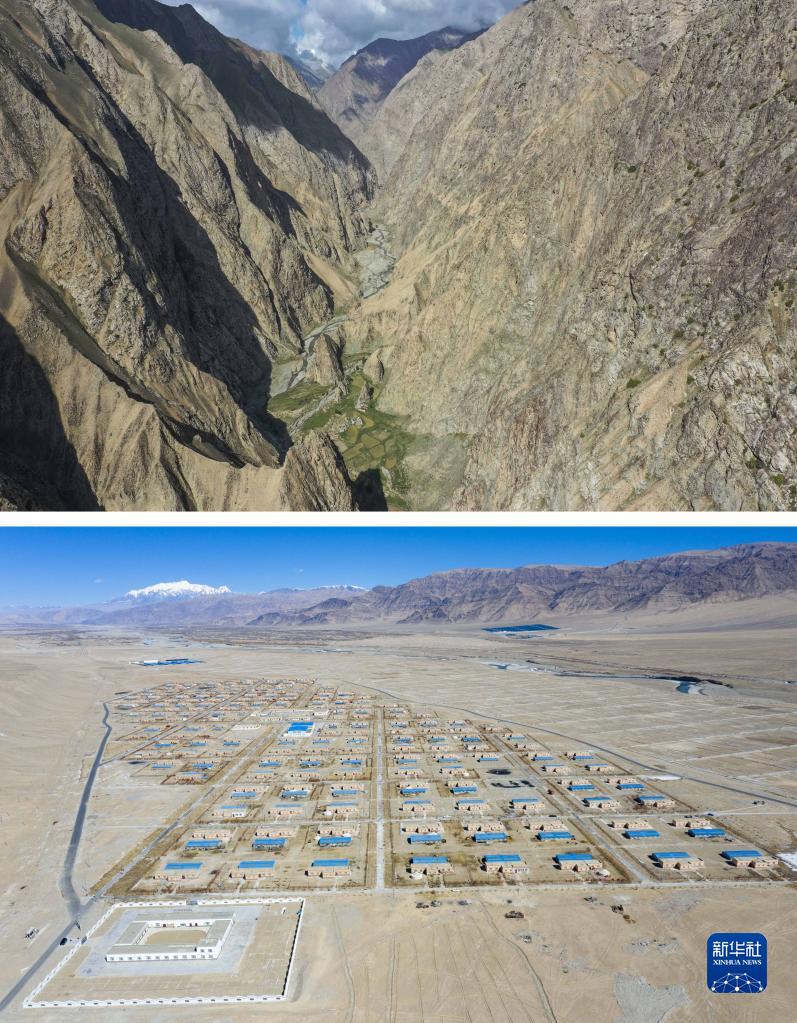 這是一張拼版照片,上圖為都熱·加爾曼一家搬遷前所居住的大同鄉阿克托尕欄桿村一小隊的山谷(無人機照片,2019年6月20日攝);下圖為都熱·加爾曼家搬遷后所在的安置點,現已命名為富民村、愛民村(無人機照片,2023年3月17日攝)。