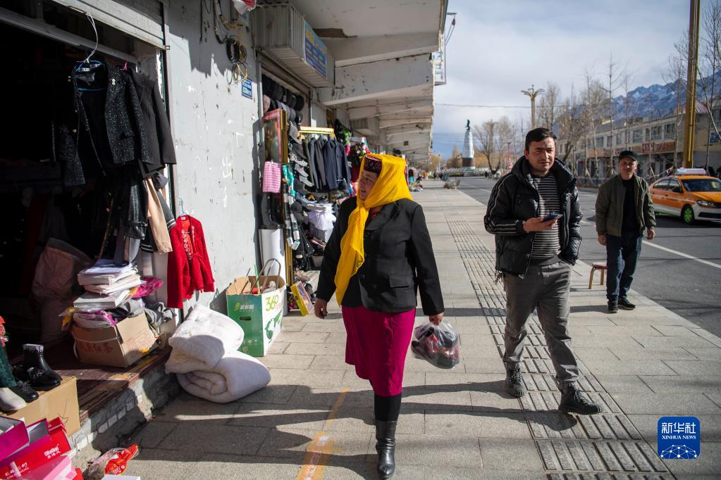 在縣城的一條商業街,努爾卡熱木·都熱(中)和母親那尼克·苦卡尼(左)逛街購買節日所需用品(2023年3月19日攝)。搬遷前,因交通不便,那尼克極少來縣城,從沒有去過喀什市城區。