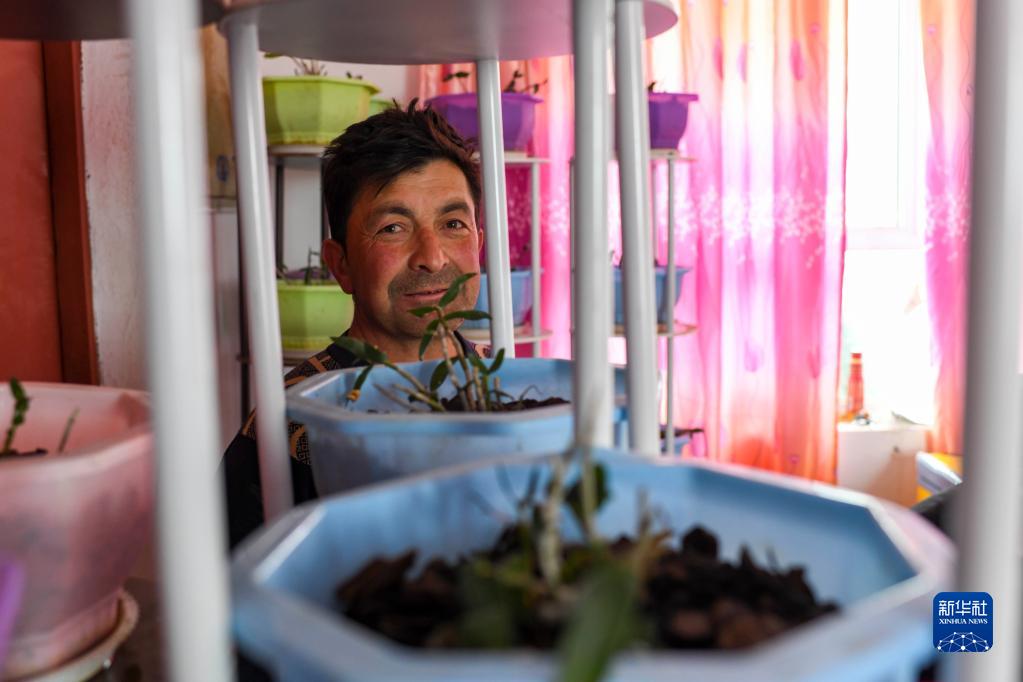 都熱·加爾曼在家中查看他種植的鐵皮石斛(2019年6月26日攝)。為促進村民增收,村委會引導都熱·加爾曼和其他村民一起種植盆栽鐵皮石斛。