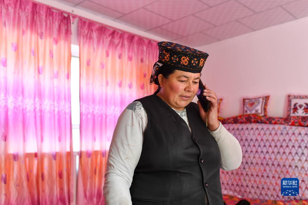 那尼克·苦卡尼在家中給在外工作的丈夫都熱·加爾曼打電話(2019年11月25日攝)。搬遷前,都熱家如果需要給在縣城的親戚打電話,只能到鄉政府所在地。