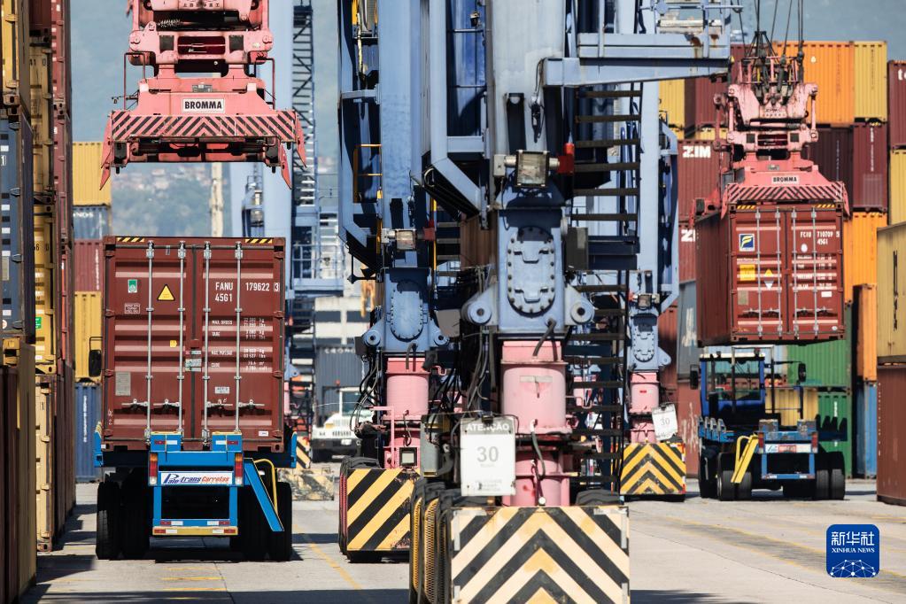 3月20日,在巴西里約熱內盧港一處集裝箱碼頭,工程機械進行裝卸貨作業。