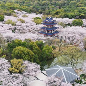 近日,江蘇無錫太湖黿頭渚景區里櫻花盛放,眾多游客前來賞櫻游玩。