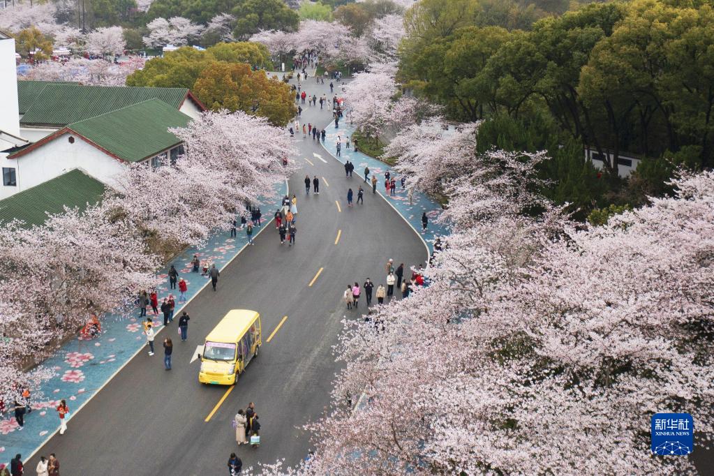 近日,江蘇無錫太湖黿頭渚景區里櫻花盛放,眾多游客前來賞櫻游玩。
