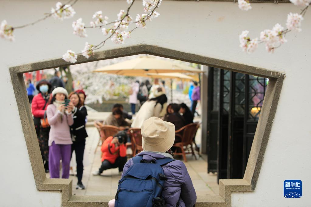 近日,江蘇無錫太湖黿頭渚景區里櫻花盛放,眾多游客前來賞櫻游玩。